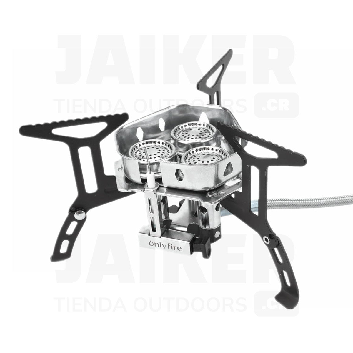 Posee sus propias patas de soporte retráctiles y el tanque de gas se conecta a través de la manguera manteniendo una distancia justa del fuego. No requiere un soporte adicional como base.